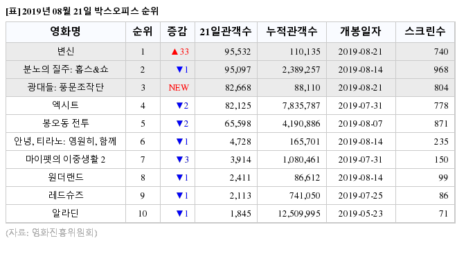영화순위 변신 박스오피스 1위 엑시트 분노의질주 홉스앤쇼 봉오동전투 광대들 풍문조작단 커런트워 애프터 관객수는