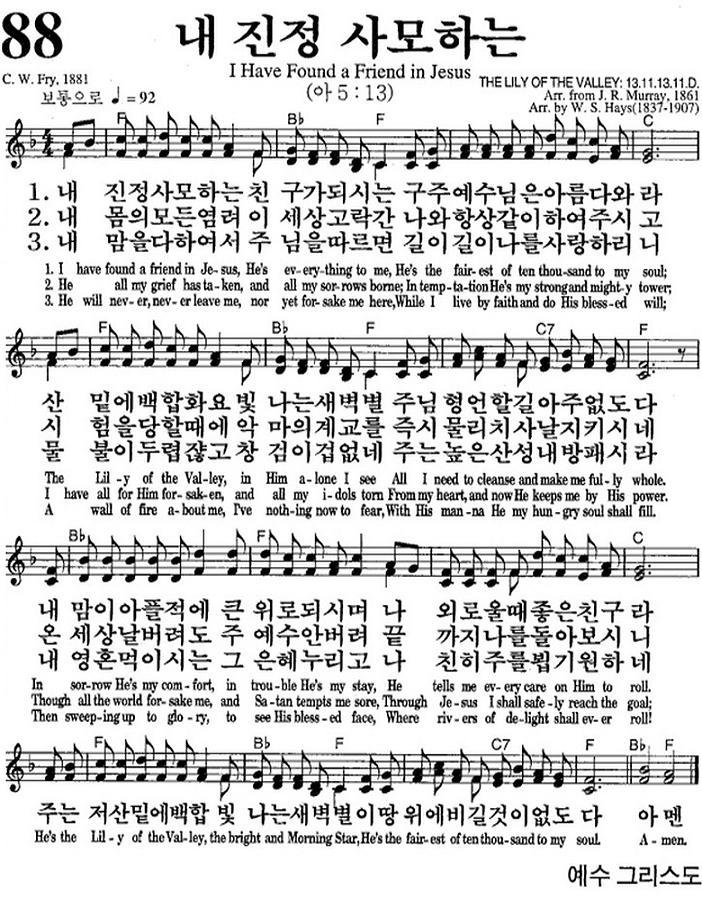在 영어 찬송 88장 내 진정 사모하는 I Have Found A Friend In Jesus 在 영어찬양 악보 영생의 말씀