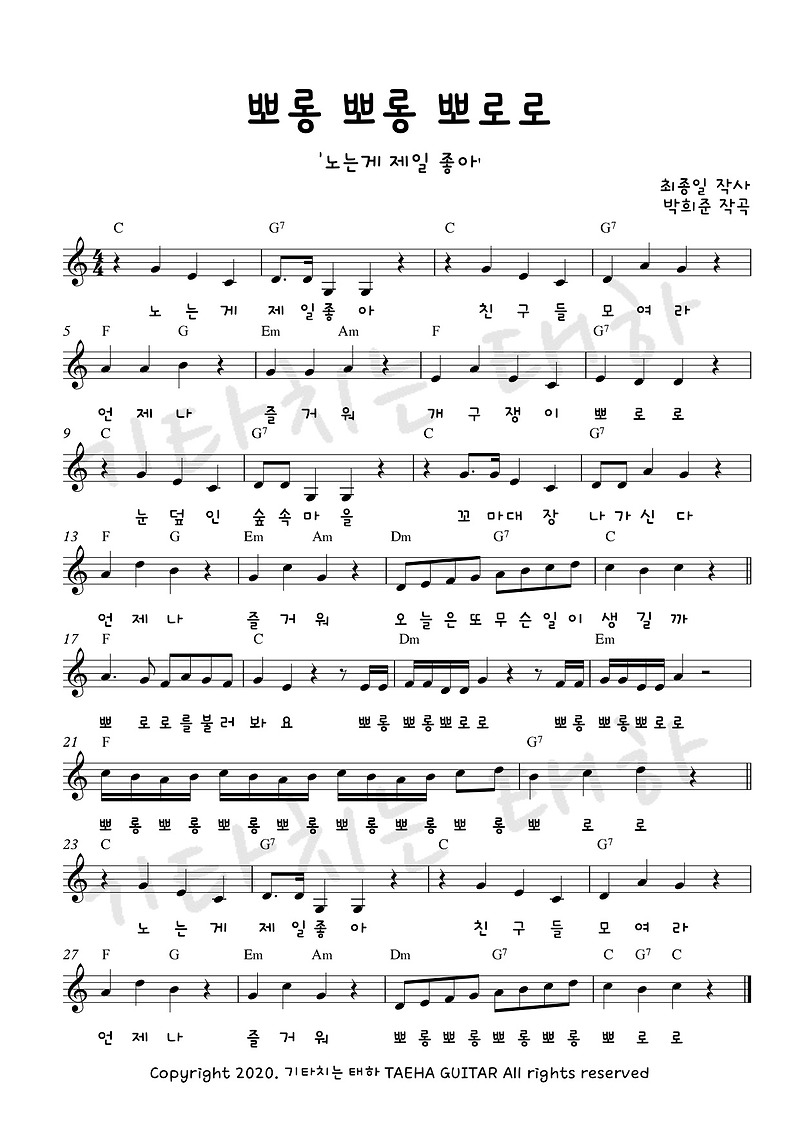 동요악보 뽀롱 뽀롱 뽀로로 노는게 제일 좋아 쉬운 악보 기타 피아노 악보 가사 통기타 코드표