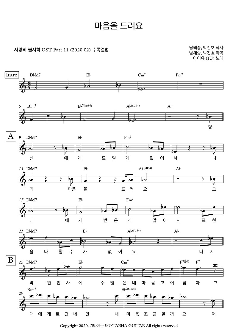 아이유 Iu 마음을 드려요 사랑의 불시착 Ost 쉬운 악보 기타 피아노 악보 가사 통기타 코드표