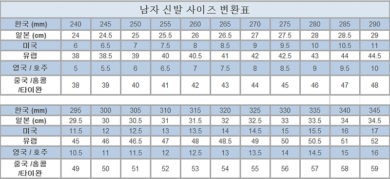 신발 사이즈 변환표 총정리 한국 미국 일본 중국
