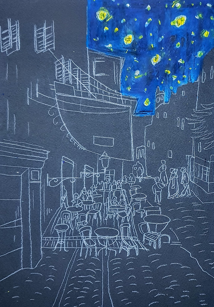 크레파스로 고흐의 밤의 카페 테라스 그리기