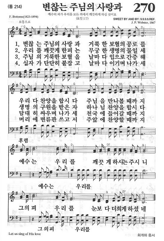 변찮는 주님의 사랑과 찬양 악보 가사 새찬송가 270장 통일찬송가 214장. 새 찬송가 21세기 찬송가 270장 변찮는 주님의 사랑과 악보 ppt 2가지 버전 가사 입니다. 예수는 우리를 깨끗게 하시는 주시니 그의 피 우리를 눈보다 더 희게 하셨네. 변찮는주님의사랑과 찬송가 ccm악보 g code 2017.