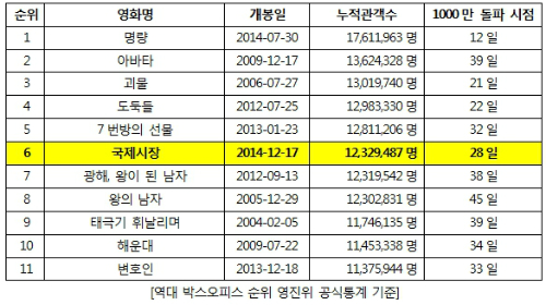 국제시장 역대 한국영화 흥행 5위 점령