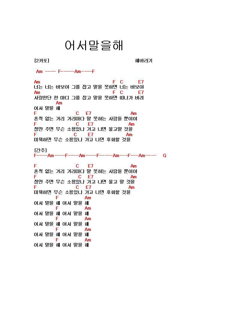 어서 말을 해 이춘근 틀어줘 노래방 악보