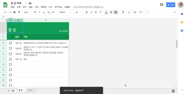Google Docs Excel 체크박스 선택시 해당줄 Off하는 조건부서식 설정 방법 팀작업시 유용