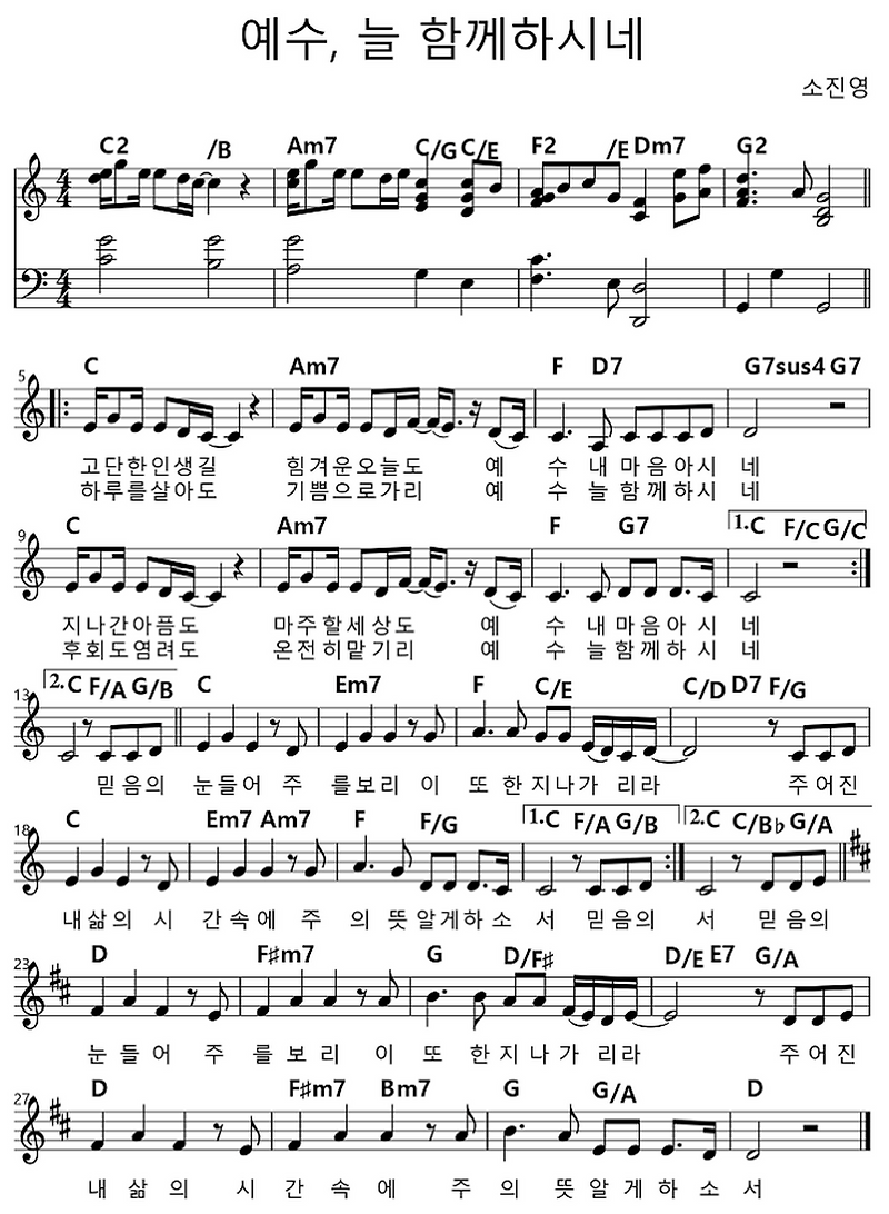 예수 늘 함께 하시네 고단한 인생길 힘겨운 오늘도 D코드 찬양 Ccm 악보 가사 Ppt