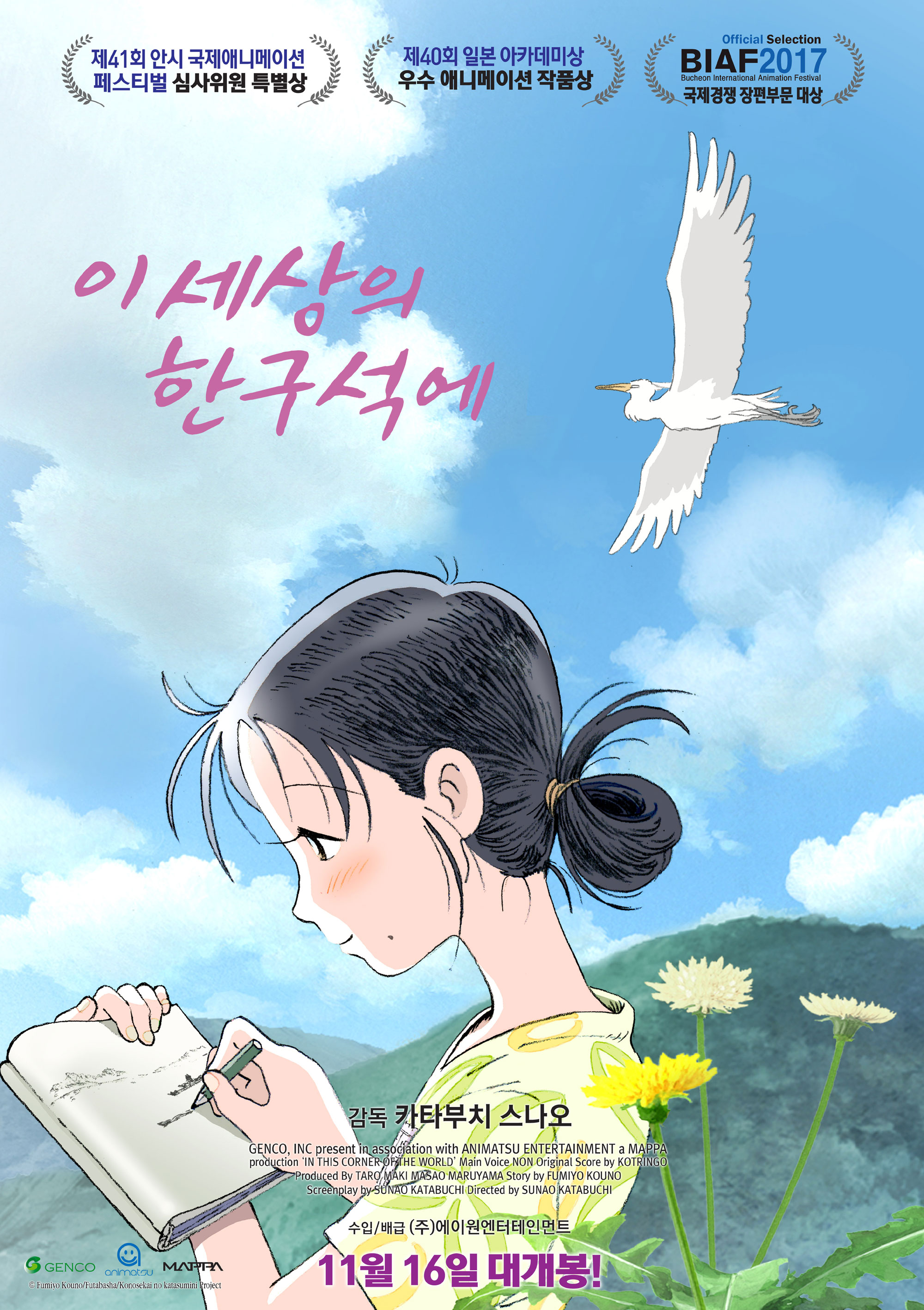 이 영화는 2007년부터 연재되 총 45회가 연재된 일본작가 코우노 후미요의 동명의 원작만화를 애니메이션화. 이 세상의 한구석에 는 제40회 일본 아카데미상에서 신카이 마코토 감독의 너의 이름은 을 꺾고 우수 애니메이션 작품상을 수상 우수 음악상에 노미네이트 되는 영광을 얻었다. 이 세상의 한 구석에 애니메이션. 평범하고도 따뜻한 가정을 꾸리던 스즈 의 삶에 태평양 전쟁이라고 불리는.