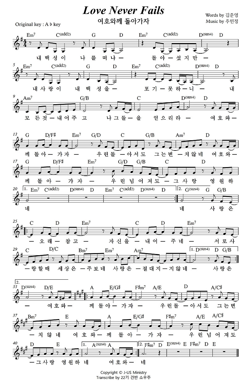 Love Never Fails 여호와께 돌아가자 제이어스 J Us G코드 악보 영상 콘티 가사 악보 가사 피아노 악보
