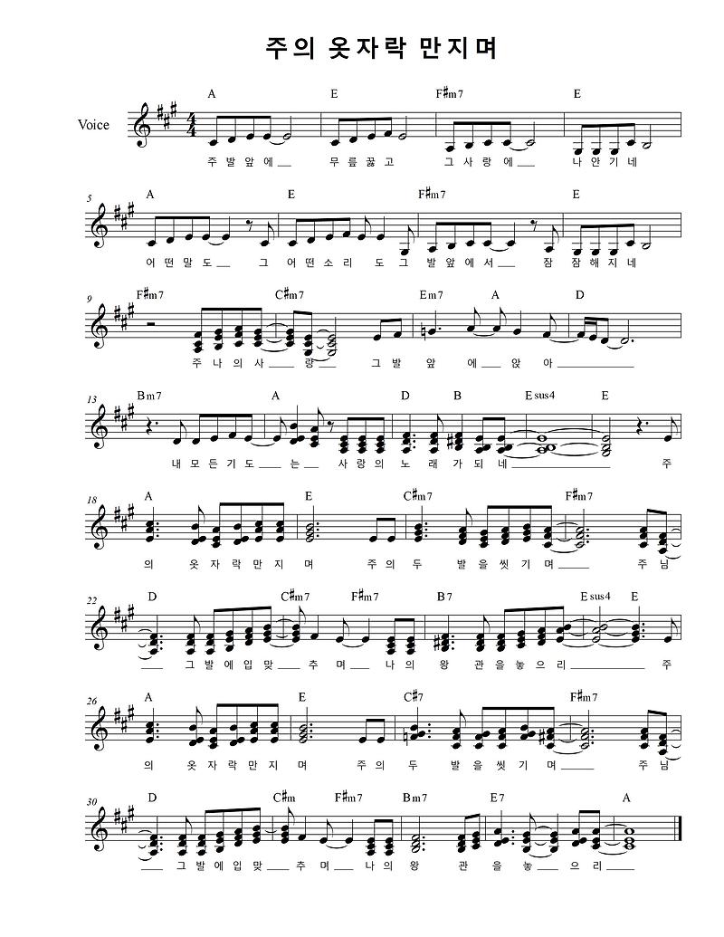 주의 옷자락 만지며 악보