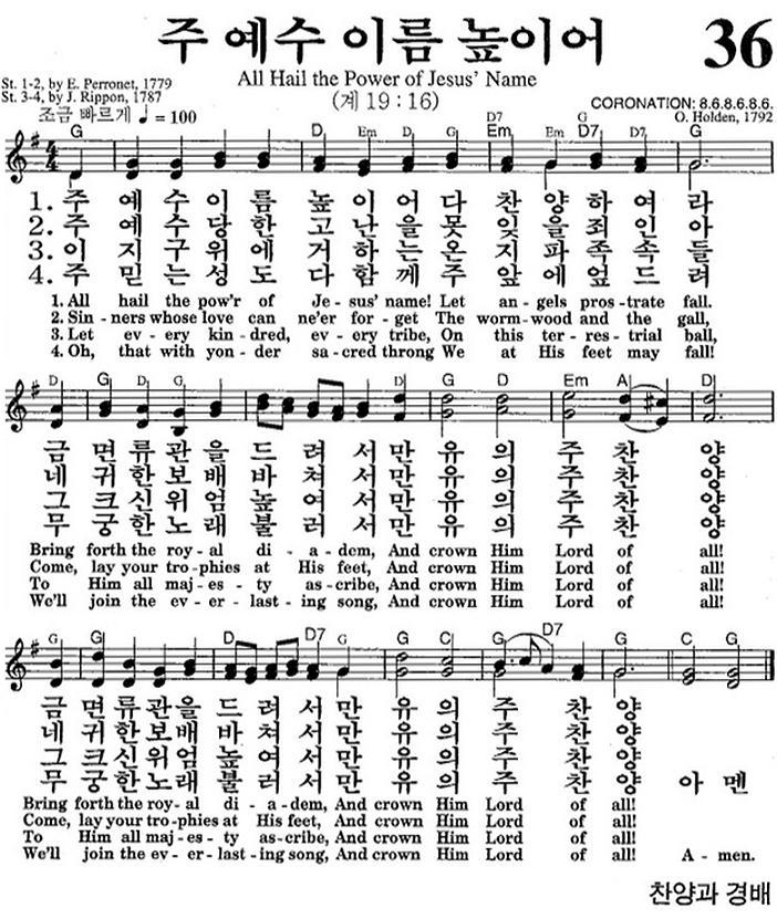 在 영어 찬송 36장 주 예수 이름 높이어 All Hail The Power Of Jesus Name 在 영어찬양악보 영생의 말씀