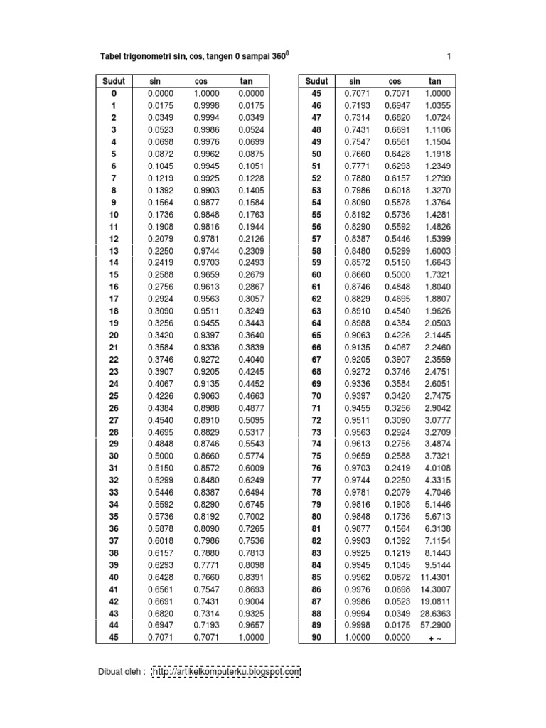 Trigonometric Table From 0 To 360 Cos Sin Cot Tan Sec Cosec